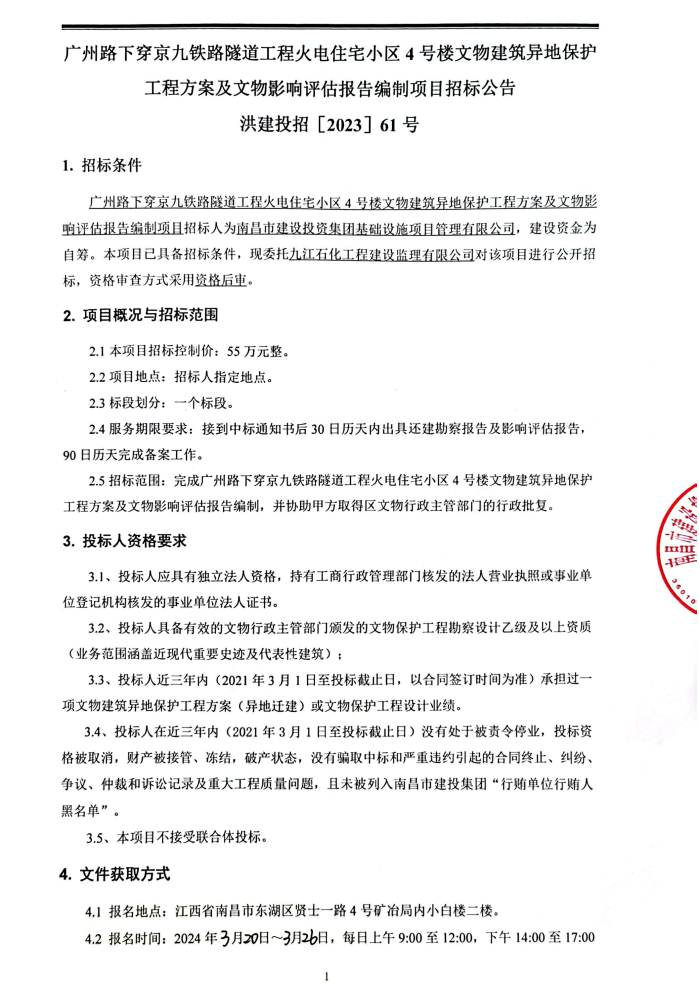 广州路下穿京九铁路隧道工程火电住宅小区4号楼文物建筑异地保护工程方案及文物影响评估报告编制项目招标公告