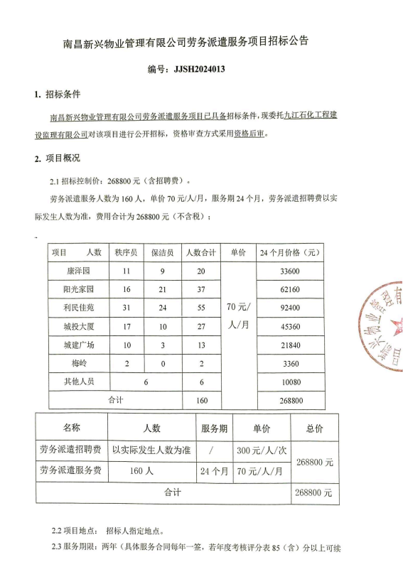 南昌新兴物业管理有限公司劳务派遣服务项目招标公告