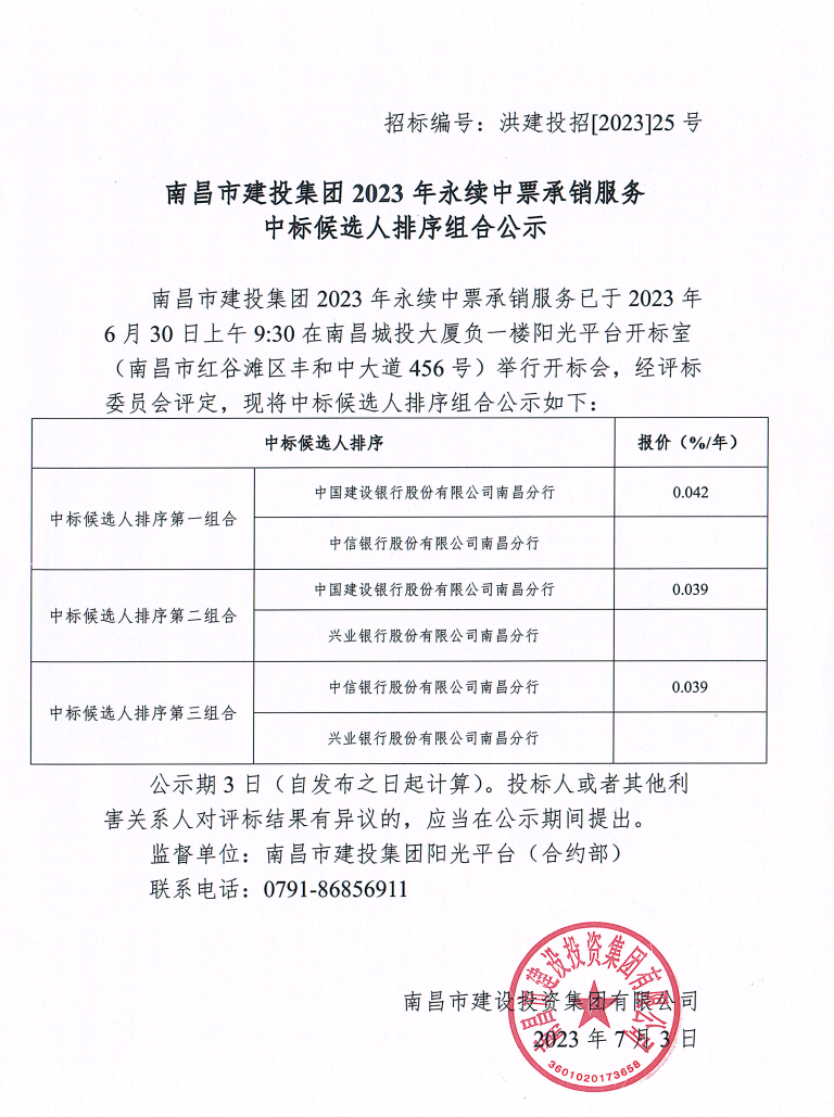 南昌市建投集团2023年永续中票承销服务中标候选人排序组合公示公示