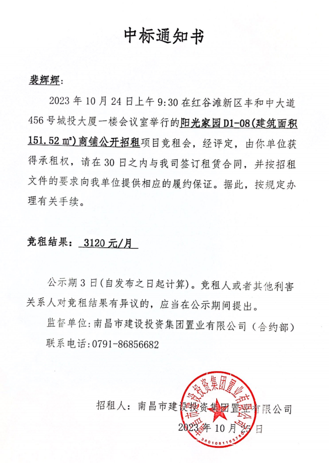 中标通知书(建投置业资产租赁项目(二)4份)